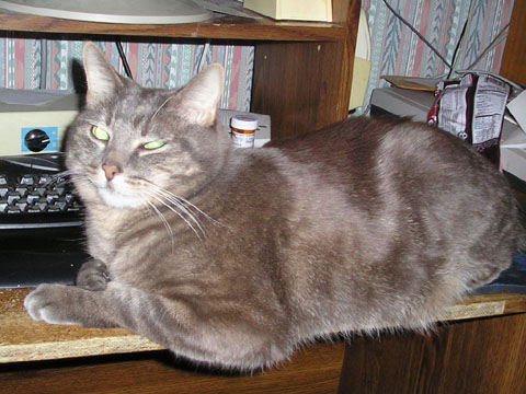 Last week I announced that due to a number of reasons, I have had to change the deadline so that people can now expect to see the updates between 12:00 noon and 3:00 Mountain time, instead of by 12:00 noon as before. I have added another reason to that list. As a cat lover, and one who would prefer to not disturb his happily resting feline companion, here's what Hobbes looked like this morning as he sat in front of my keyboard and stayed there for over an hour: